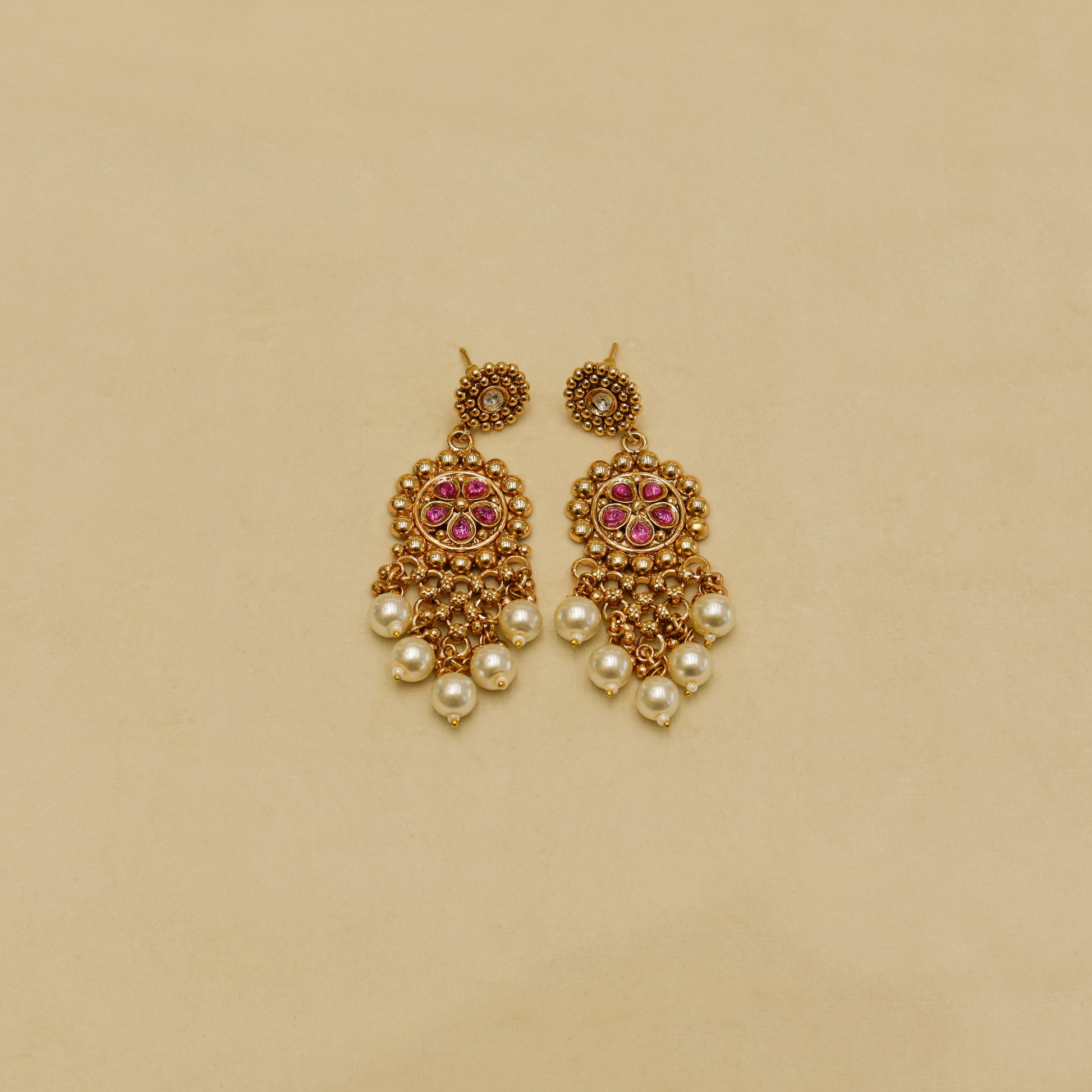 The Aanura Pearl Bridal Choker Necklace is a statement piece crafted with intricate kundan crystals, ruby floral motifs, and cascading pearl drops. Its lattice-style design exudes grandeur and elegance, while the antique gold finish enhances its regal charm. Paired with matching pearl-studded earrings, this set is a true bridal showstopper.