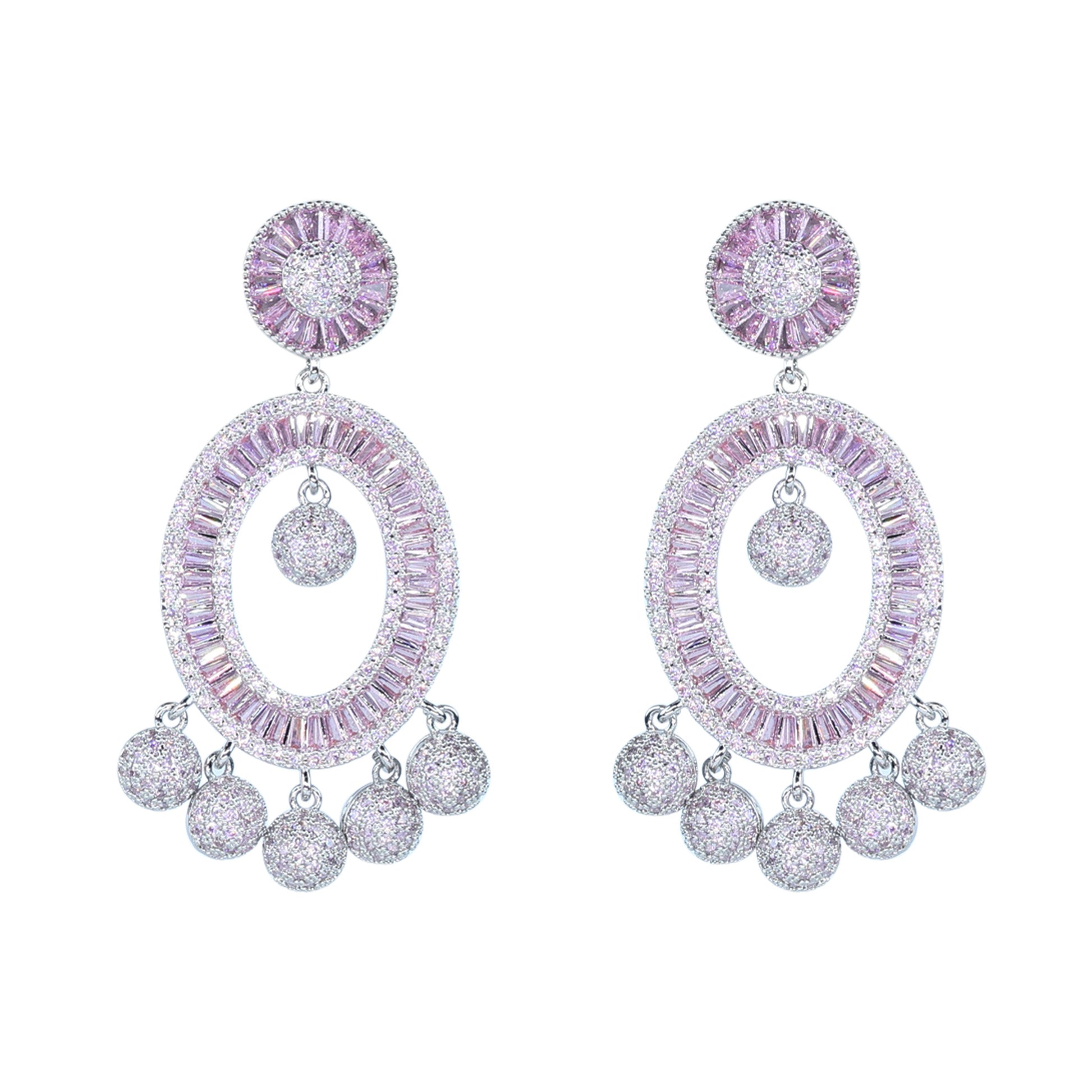 These earrings feature a striking oval design outlined with pink baguette CZ stones, complemented by delicate sparkling clusters. Their contemporary drop silhouette adds movement and brilliaLJe, making them perfect for standout looks.