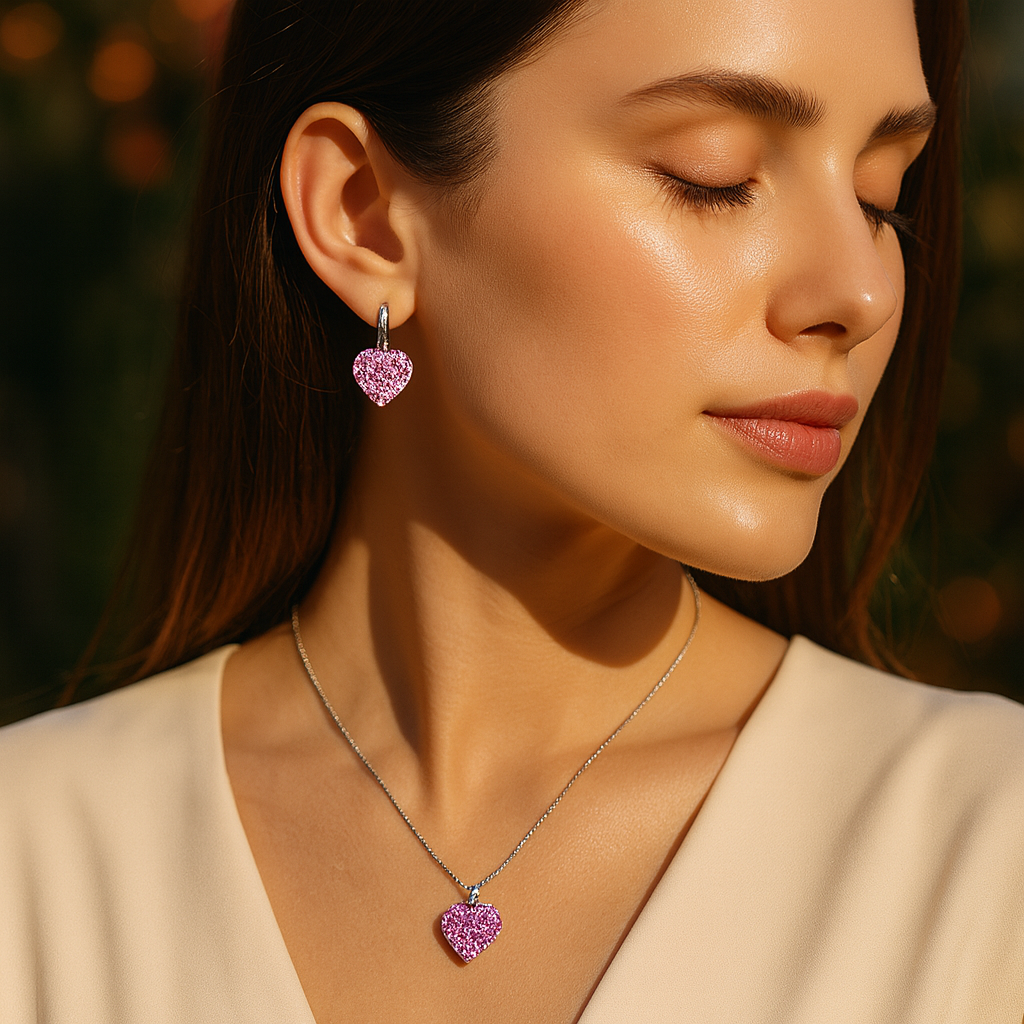 The Aanura Pink Heart Necklace & Earrings Set is the ideal gift for yourself or a loved one. A timeless design that adds sparkle, love, and elegance to every outfit.