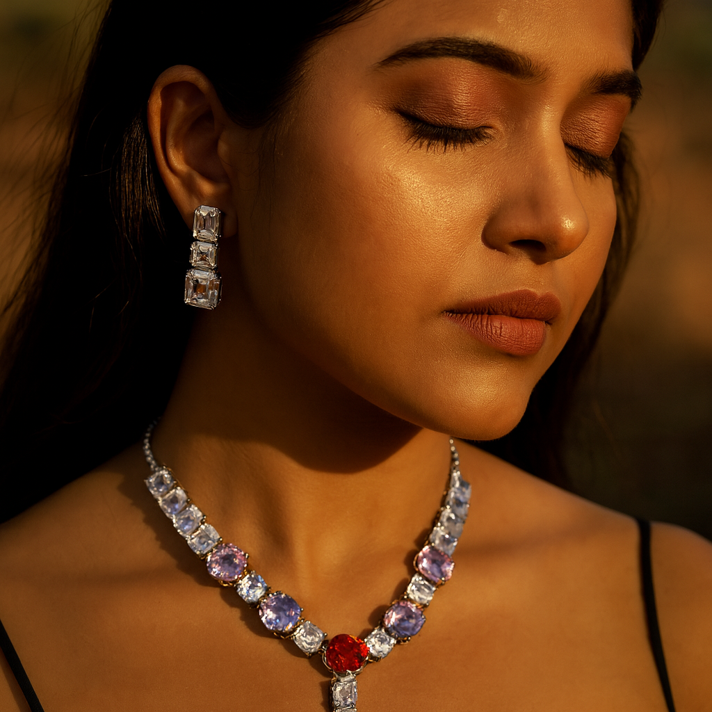 This stainless steel multicolor crystal necklace set with a bold red centerpiece and drop design makes a statement of glamour and elegance. Perfect for weddings, parties, and festive occasions.