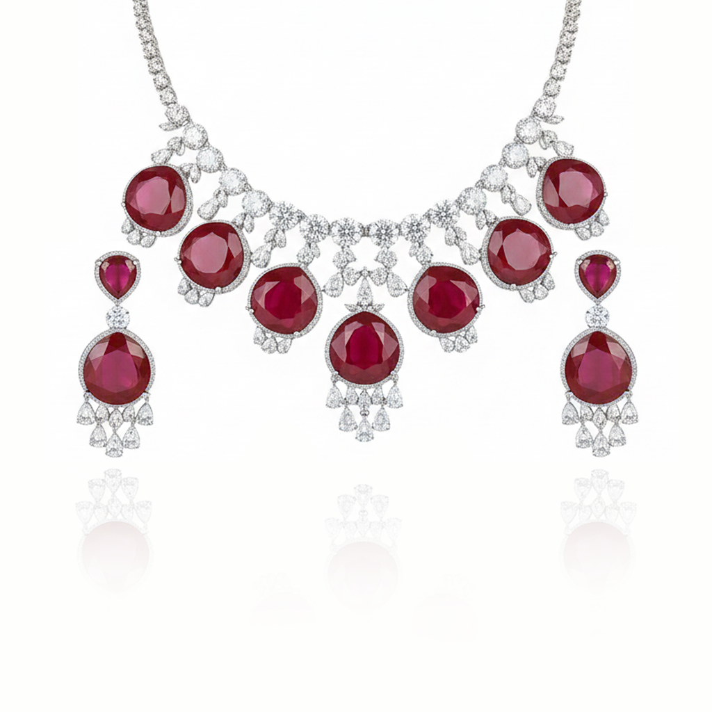 The Royal Purple Crystal Drop Necklace Set is a breathtaking design featuring oversized round-cut purple crystals framed with cascading white crystal drops. Set in polished stainless steel, this necklace radiates grandeur and comes with matching statement earrings, making it a perfect piece for weddings, receptions, and high-profile occasions.