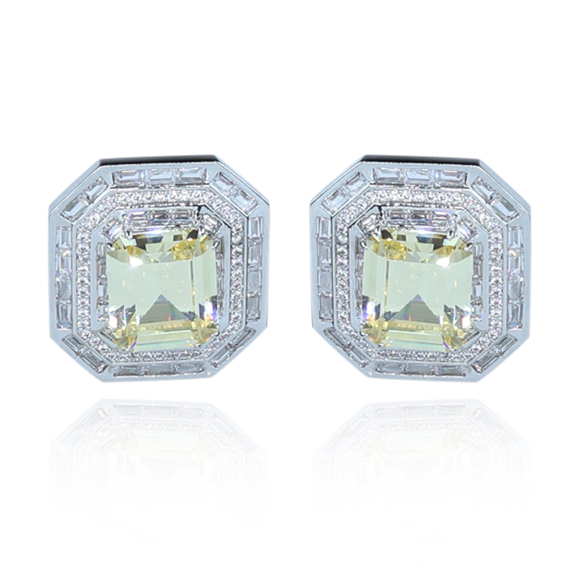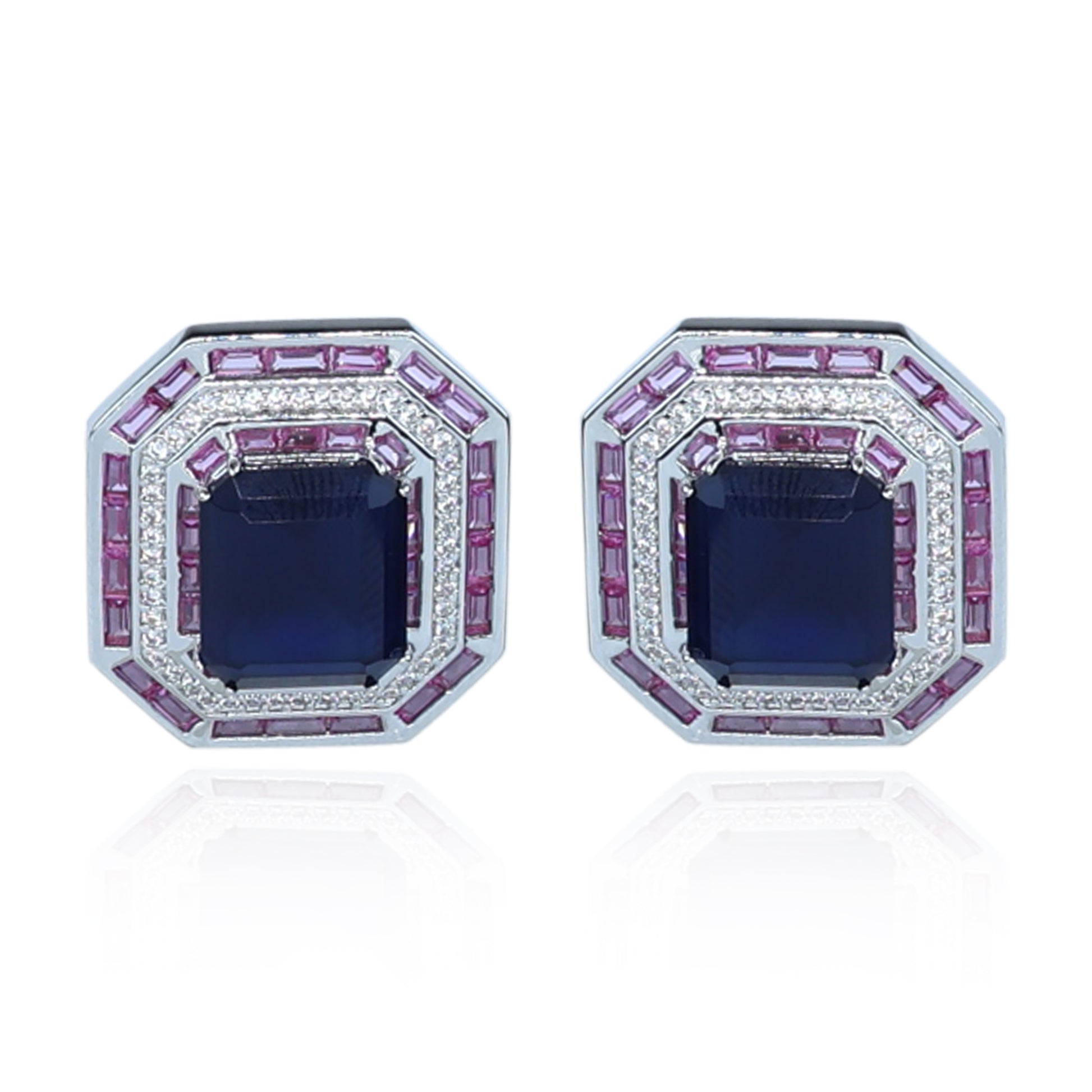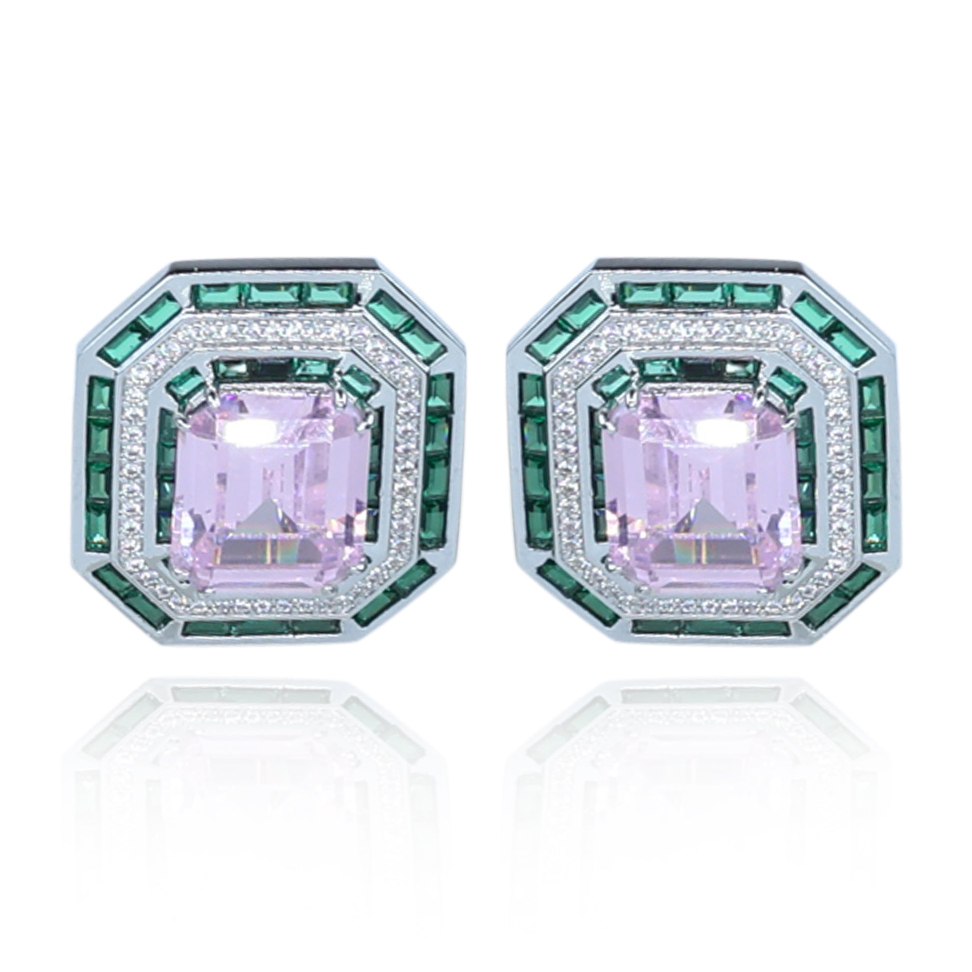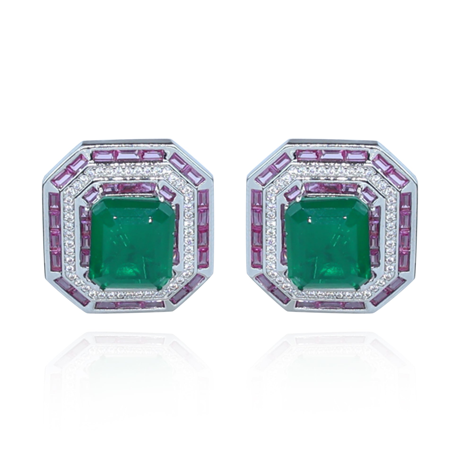 The octagonal design reflects a balance of tradition and modernity. The bold ruby center adds richness, while the emerald-green baguettes bring vibrancy. Together with the CZ halo, these studs make a perfect statement piece for any grand occasion.