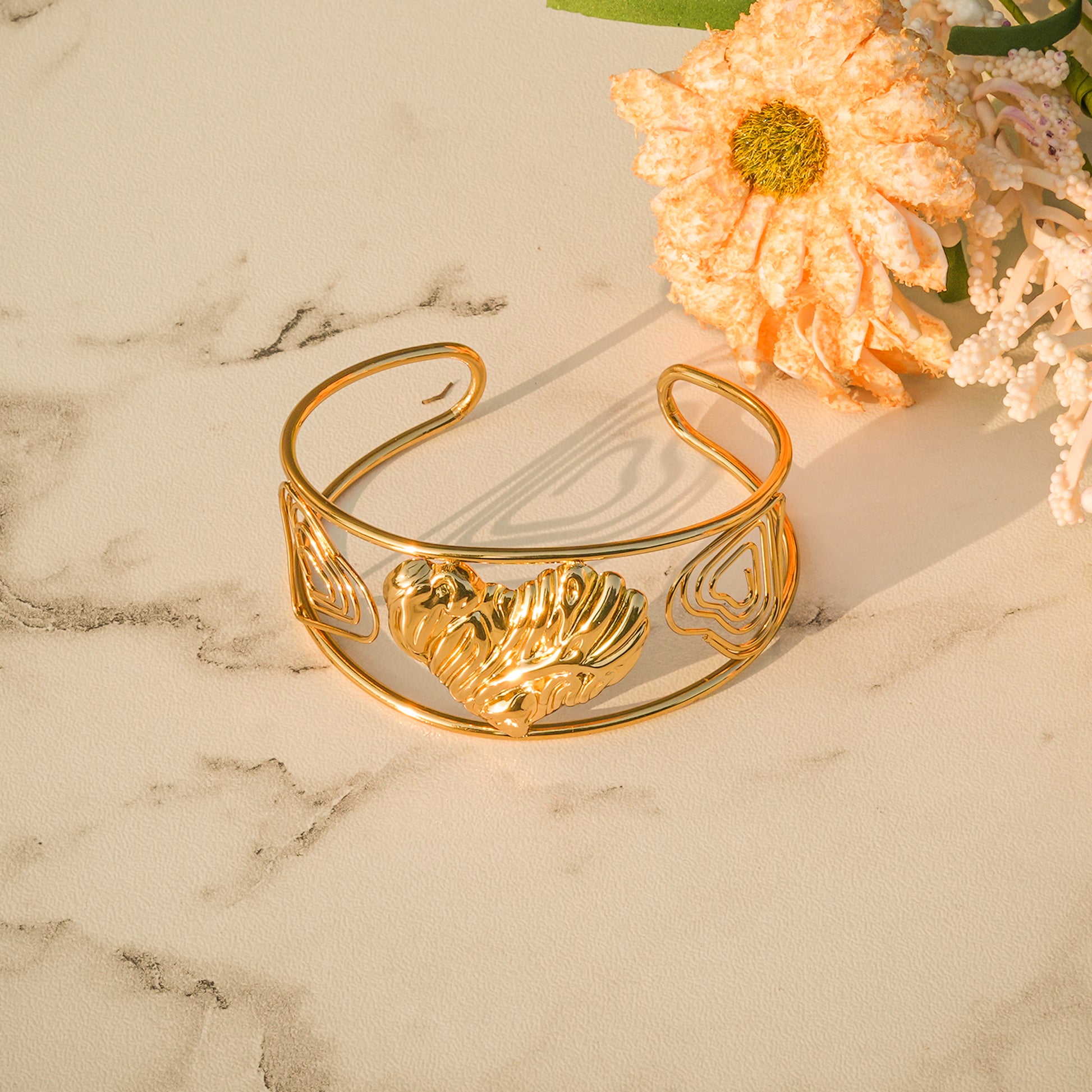 This elegant Aanura open cuff bracelet features a bold sculpted leaf centerpiece framed by flowing cutwork side panels. The organic leaf motif adds a natural yet artistic touch, while the smooth open-cuff structure ensures comfort and effortless styling. Finished with a radiant high-polish surface, this bracelet is designed for women who love statement jewellery with a refined, modern aesthetic.