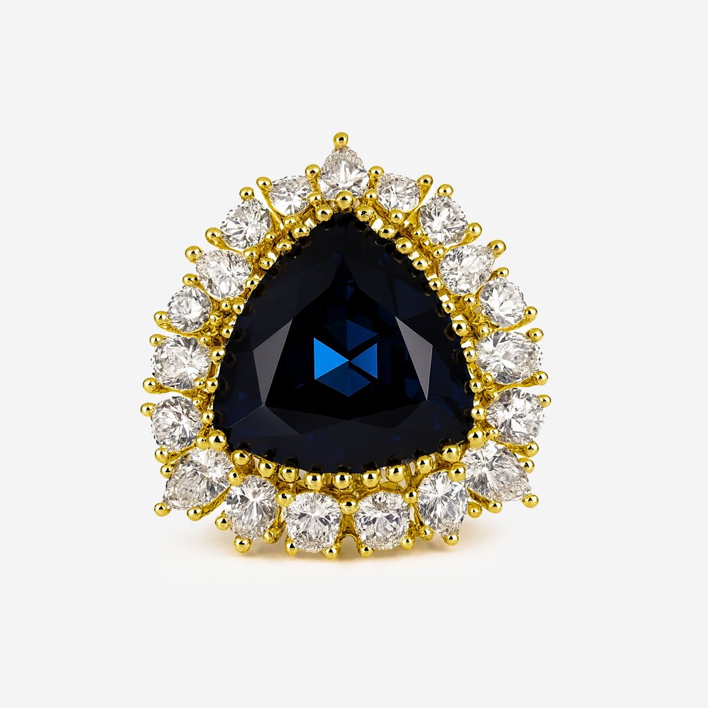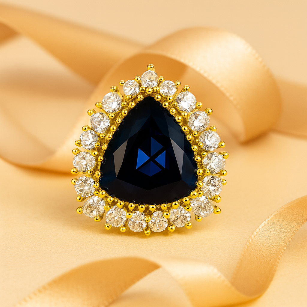 - Design: Central gemstone with baguette-cut crystal halo