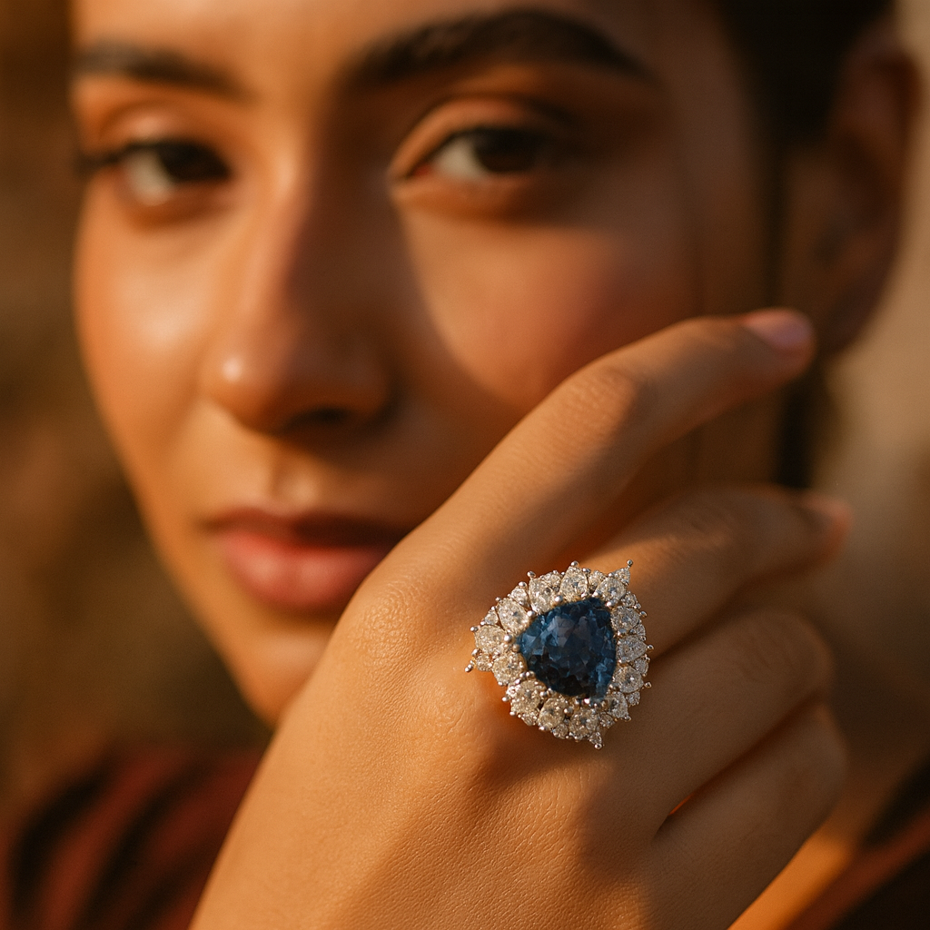 The Aanura Silver Crystal Baguette Halo Cocktail Ring is a sparkling masterpiece, designed for women who love bold luxury and radiant elegance at weddings, galas, and festive events.