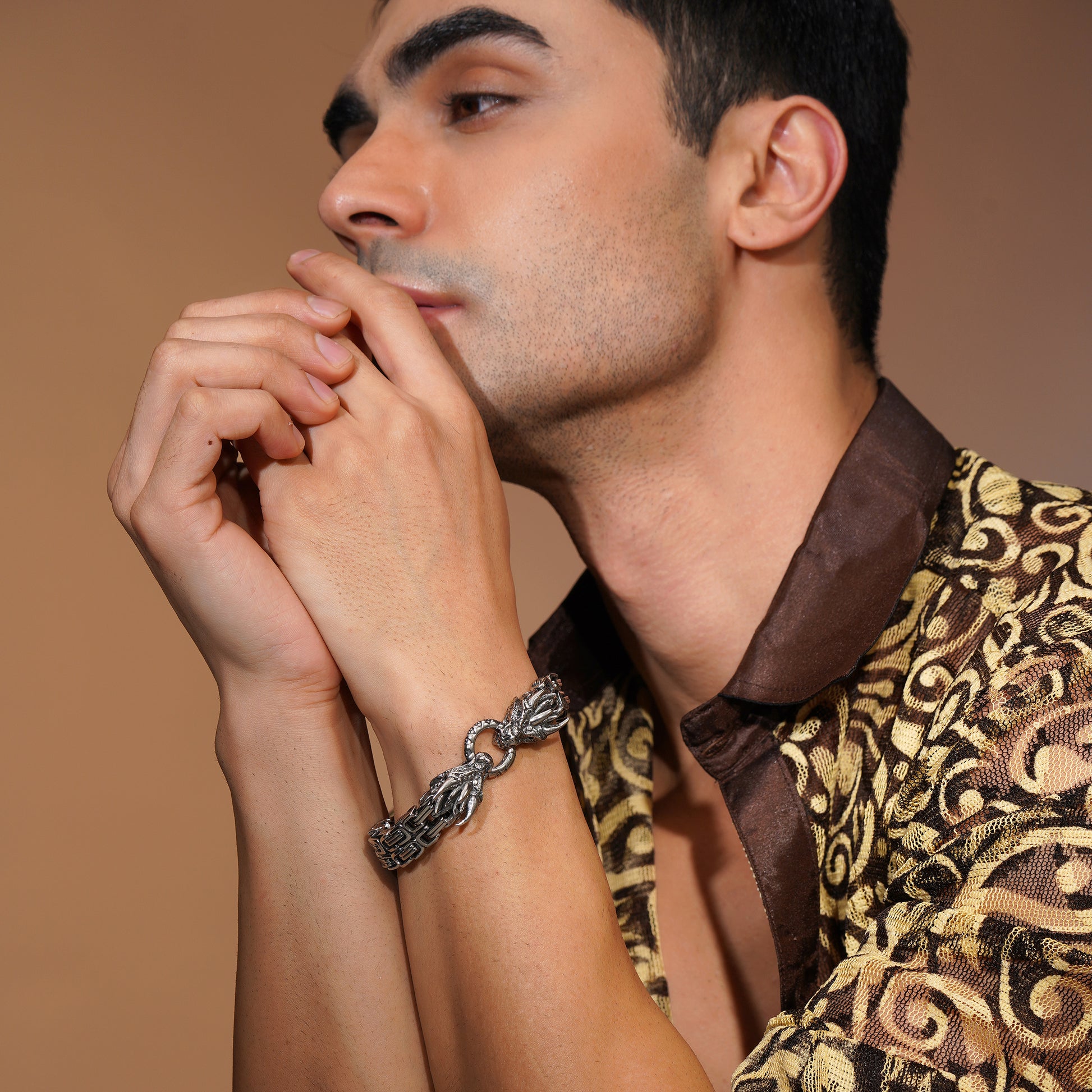 This striking statement bracelet features an intricate dragon-head clasp paired with a bold, tightly interlocked link chain. Finished in a rugged silver-tone with deep engraved detailing, the design blends mythic symbolism with modern strength. The substantial build and detailed craftsmanship make this bracelet a powerful accessory for men who prefer bold, masculine jewellery with character.