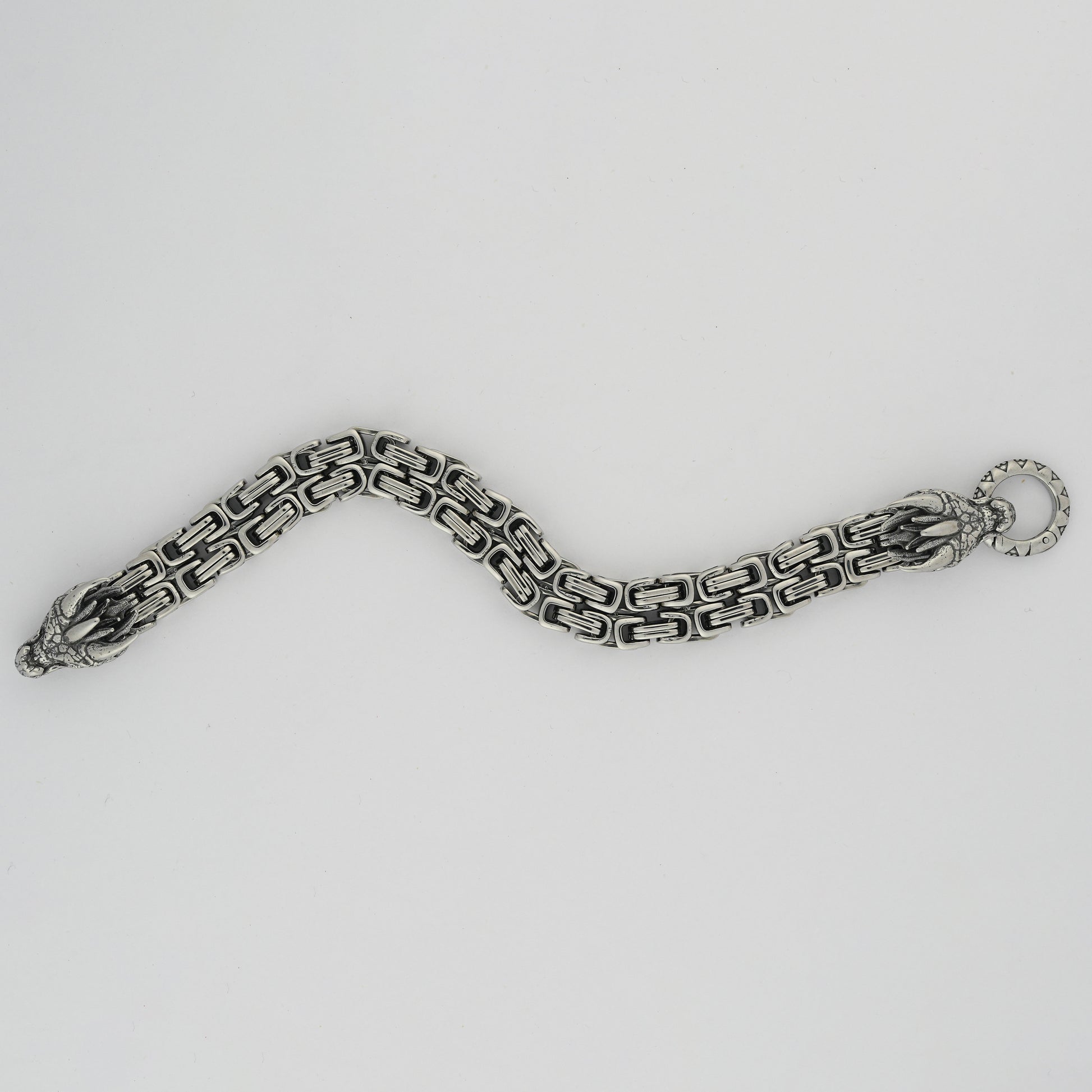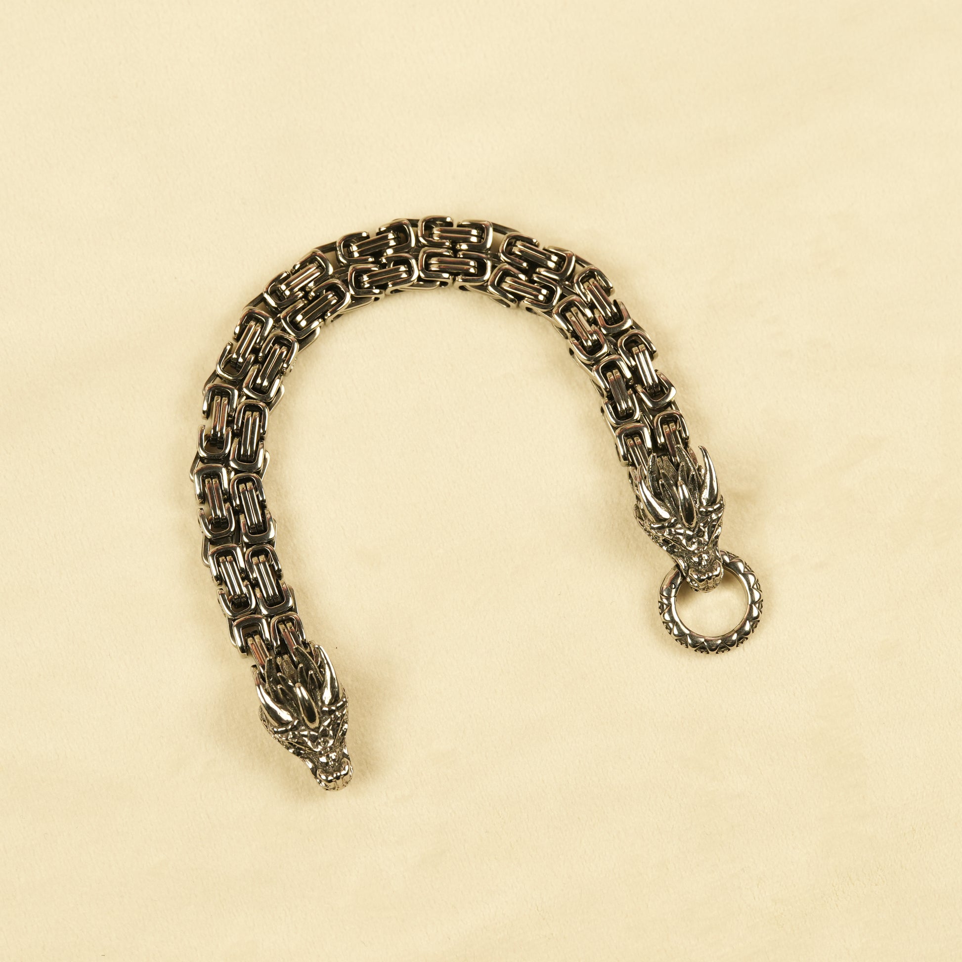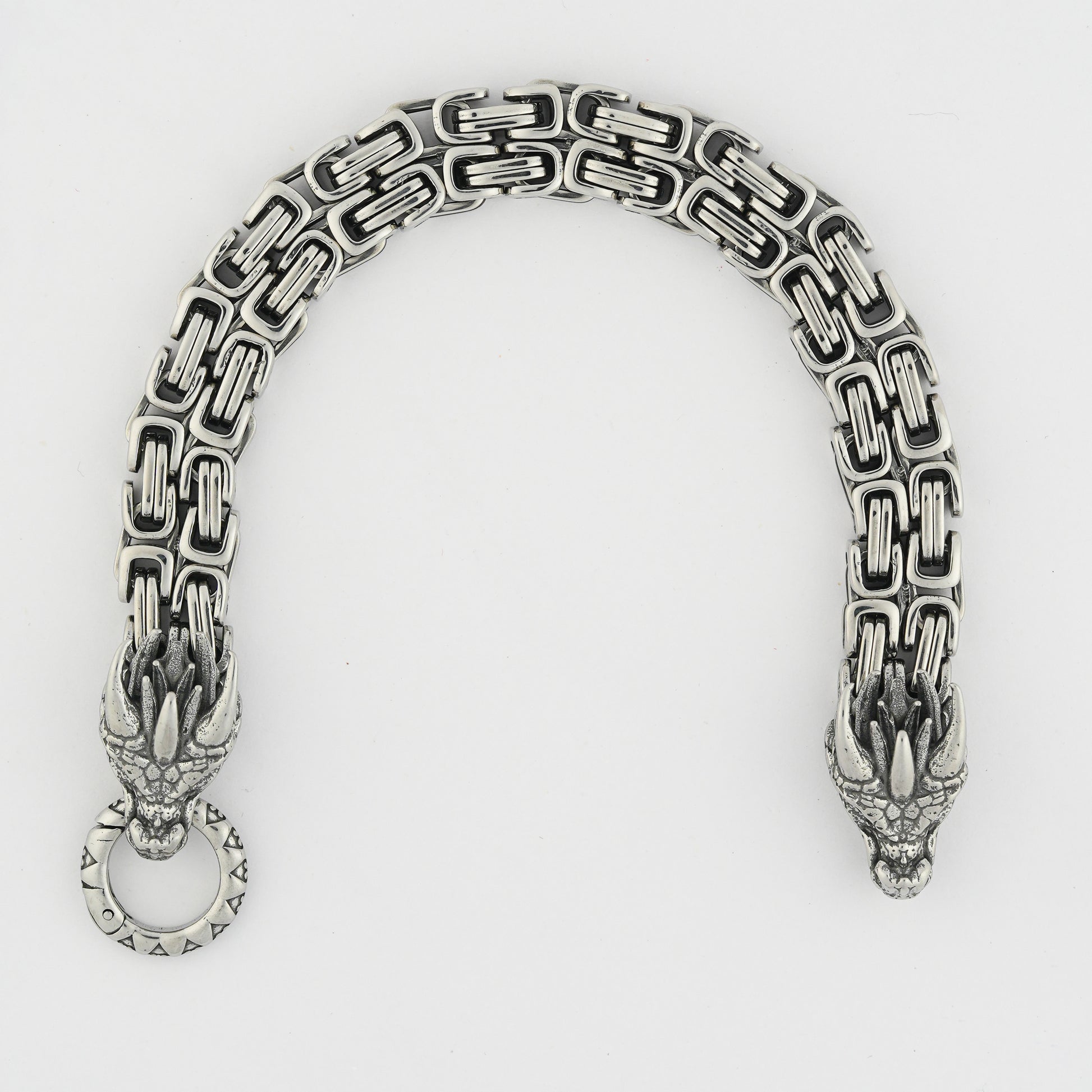 - Design Detail: Dragon head clasp with engraved circular ring and interlocked chain links