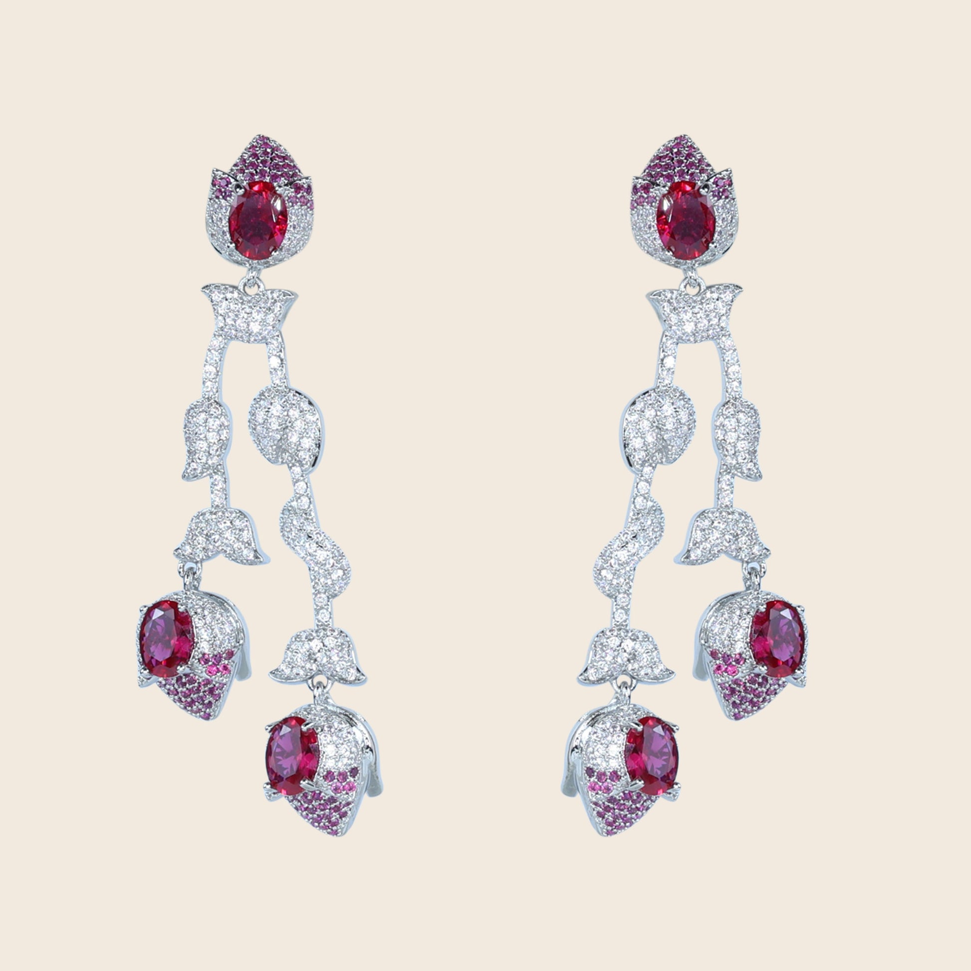 The cascading design represents grace and vibrance, while the ruby-red stones bring passion and luxury. These earrings are ideal for women who love eye-catching accessories with a refined touch.
