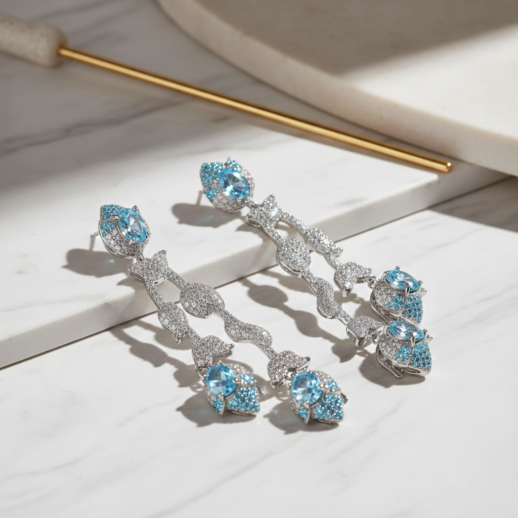 The Aanura Silver Ruby Dangle Statement Earrings are a bold and artistic choice, combining ruby brilliance with a flowing design—perfect for weddings, galas, and special celebrations.
