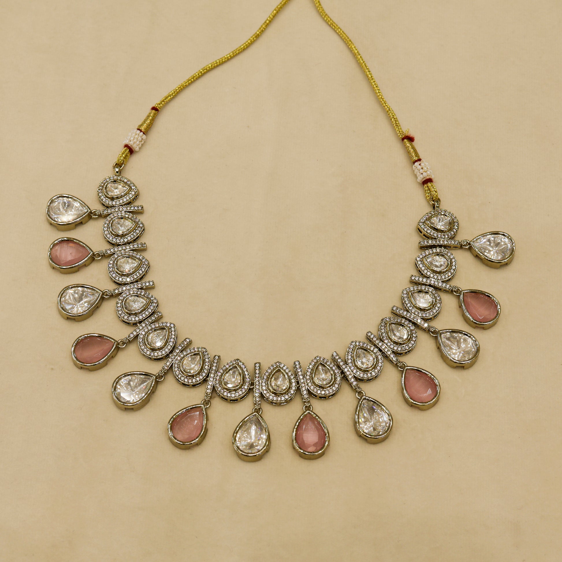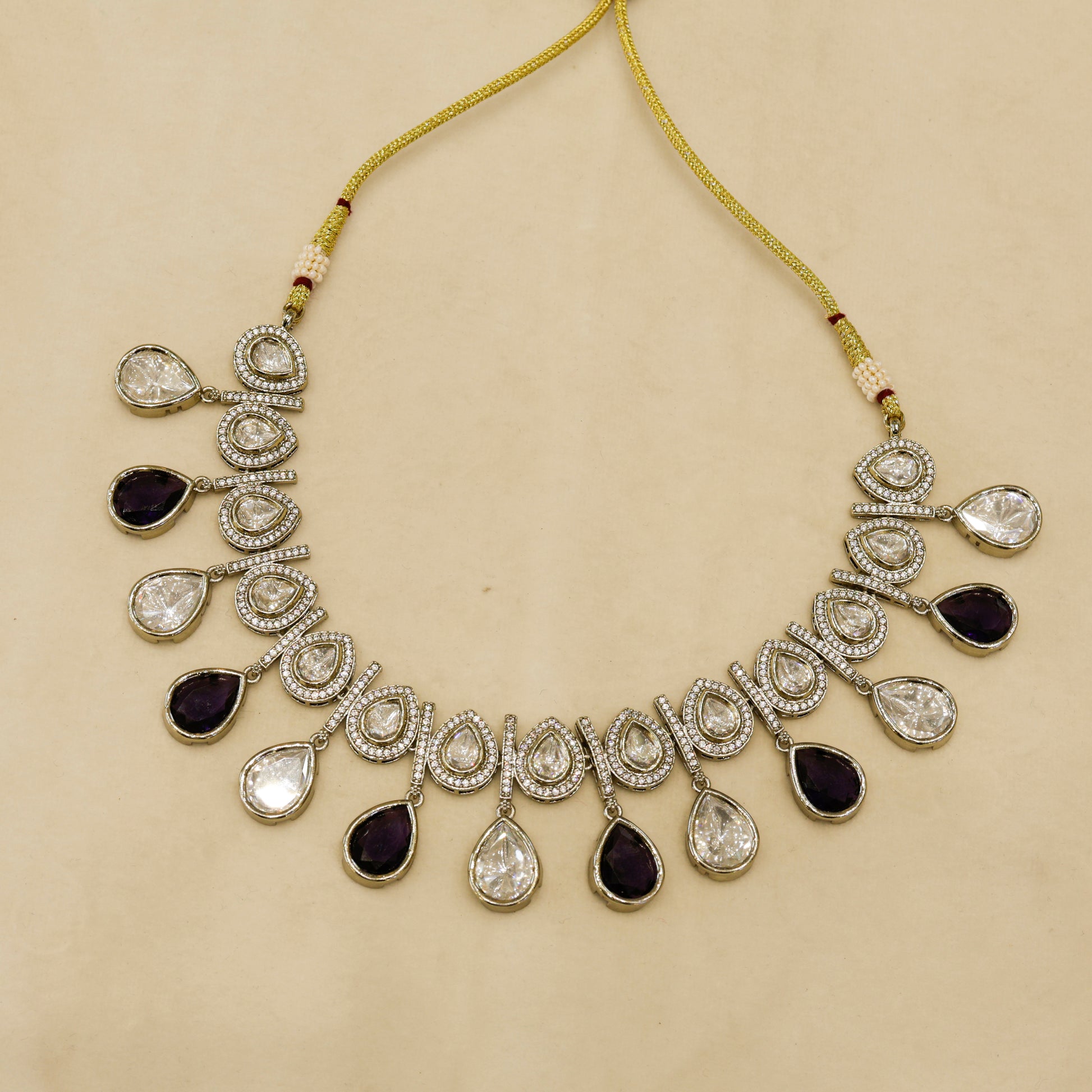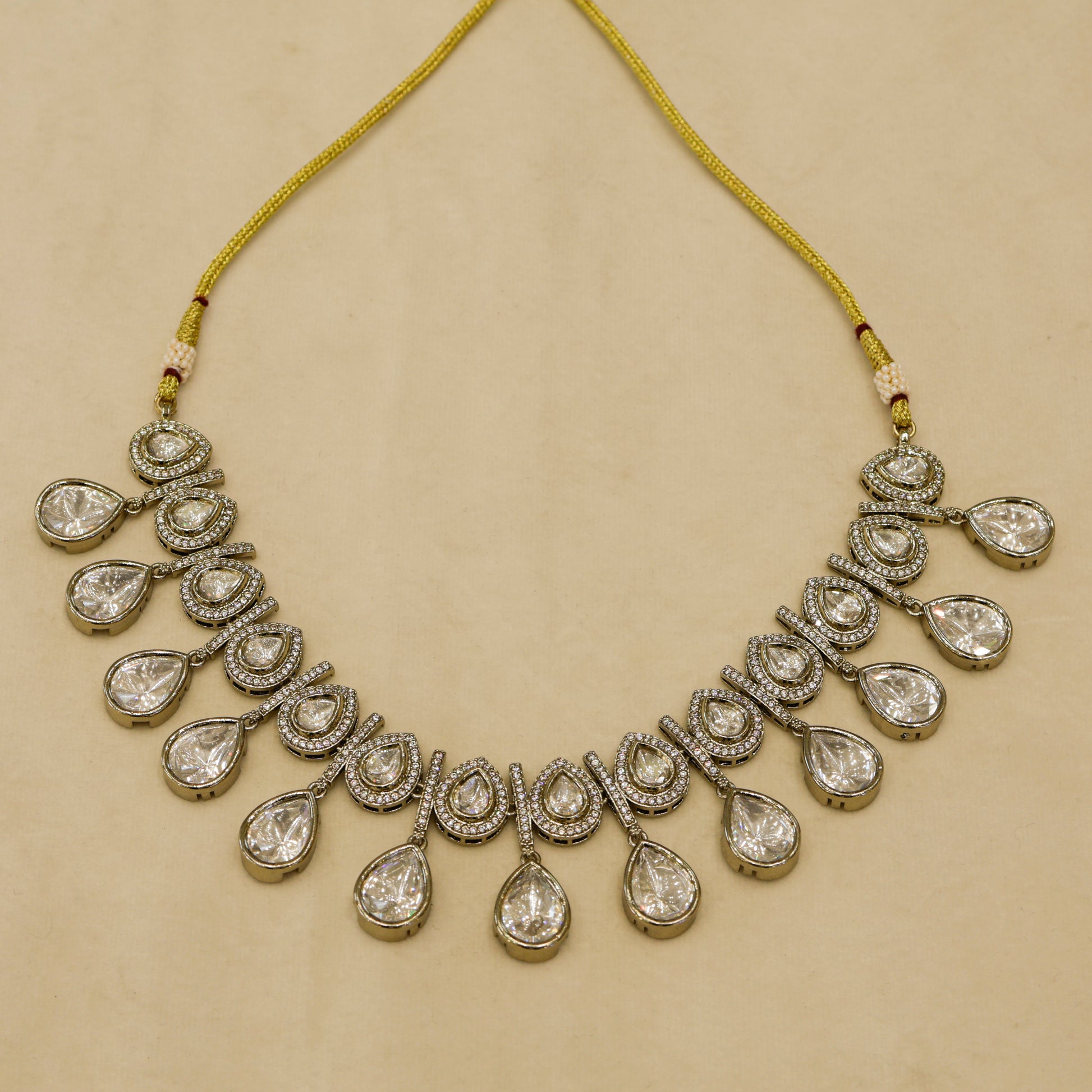 The Aanura Teardrop Kundan Necklace Set is a striking design that blends classic kundan stones with alternating white and black teardrop drops. The necklace features a symmetrical arrangement of embellished motifs, giving it a bold and sophisticated charm. Matching long earrings complete the ensemble.