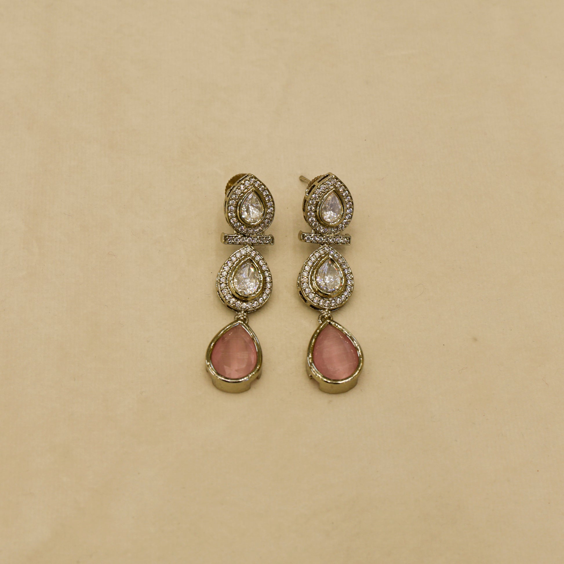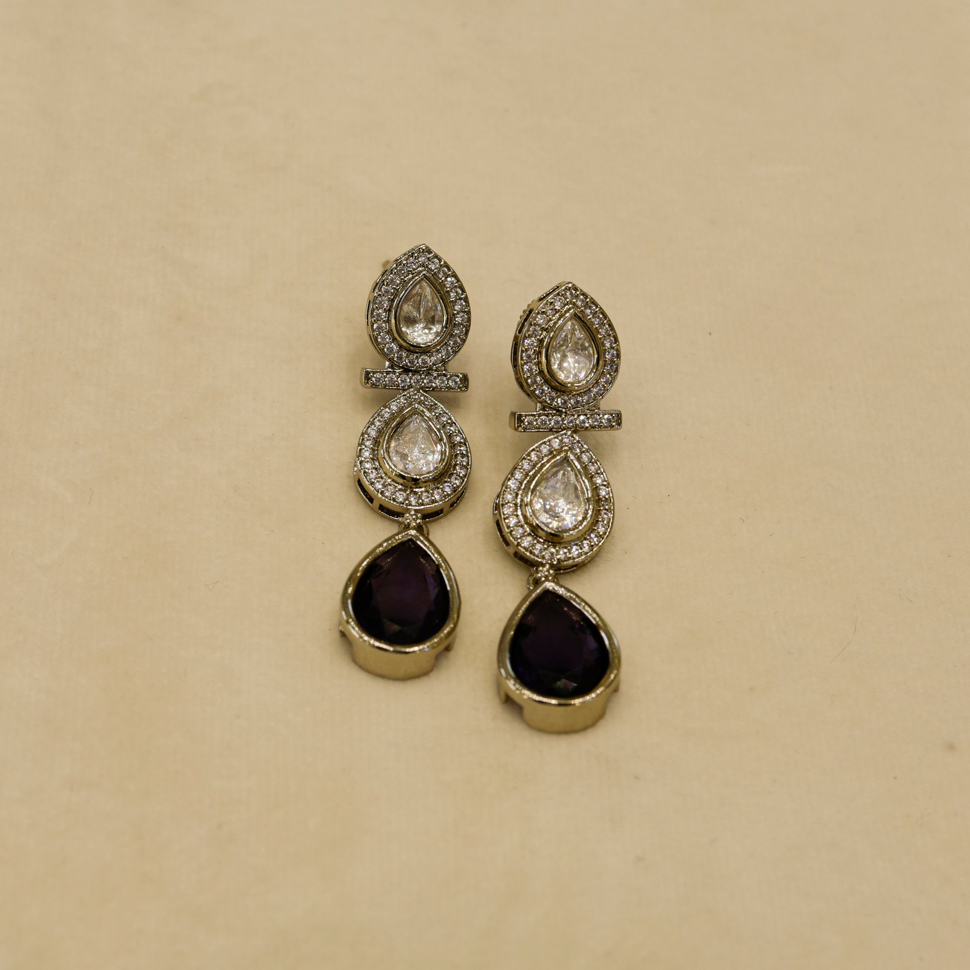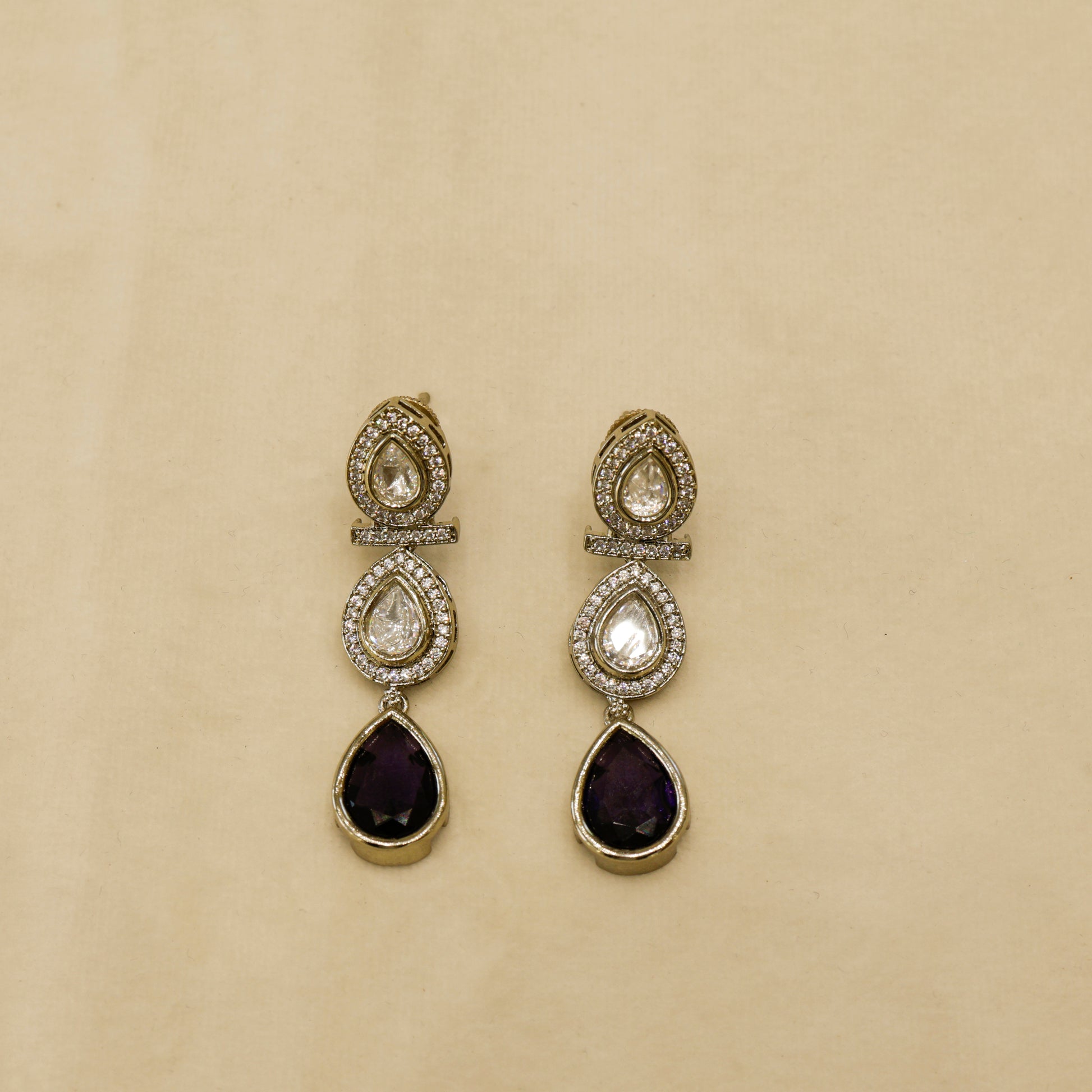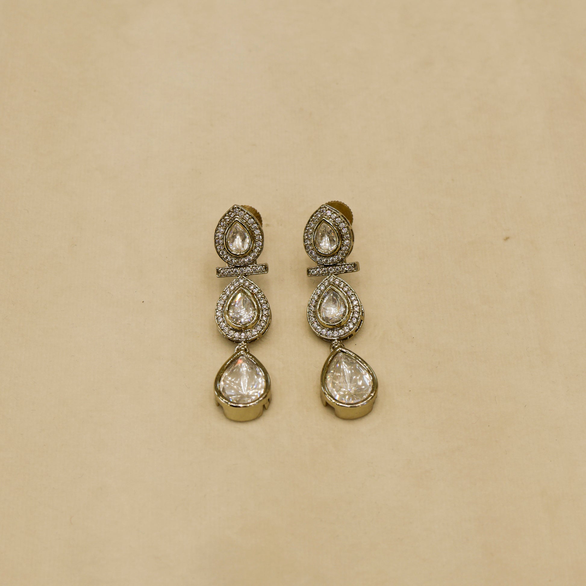 The Aanura Teardrop Kundan Necklace Set is a striking design that blends classic kundan stones with alternating white and black teardrop drops. The necklace features a symmetrical arrangement of embellished motifs, giving it a bold and sophisticated charm. Matching long earrings complete the ensemble.