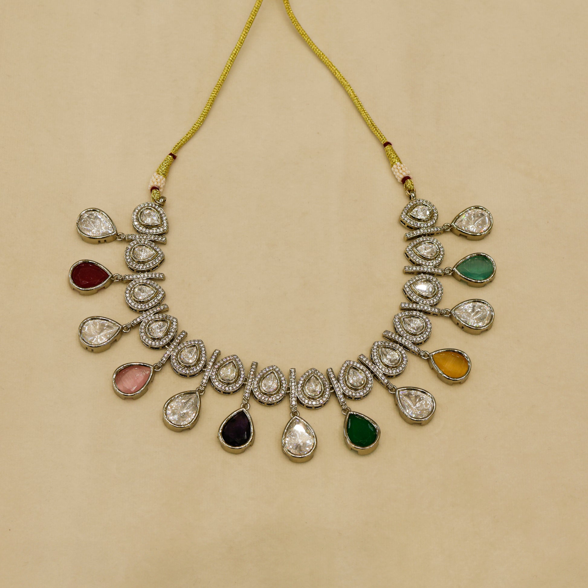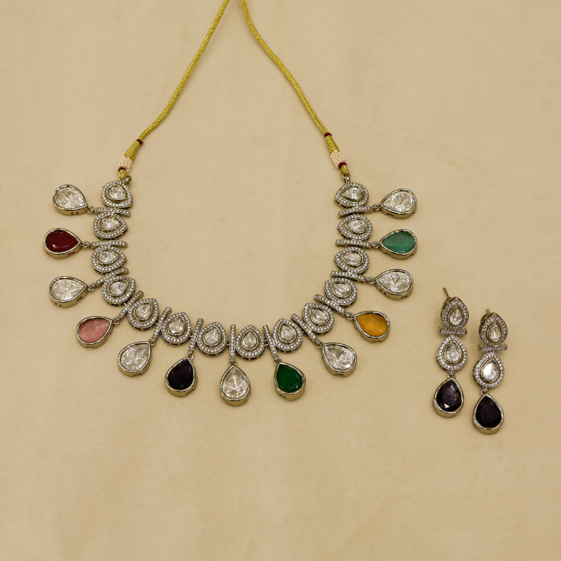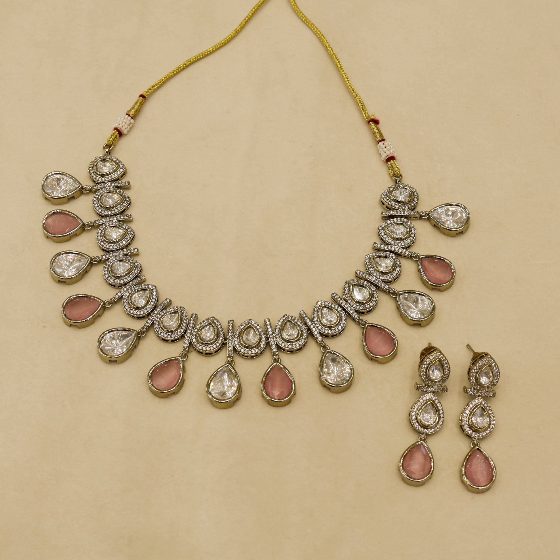 Aanura Teardrop Kundan Necklace with Dual-Tone Drops & Earrings