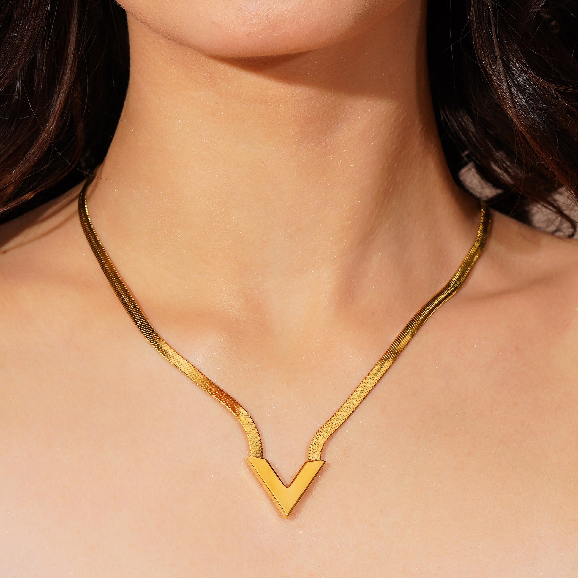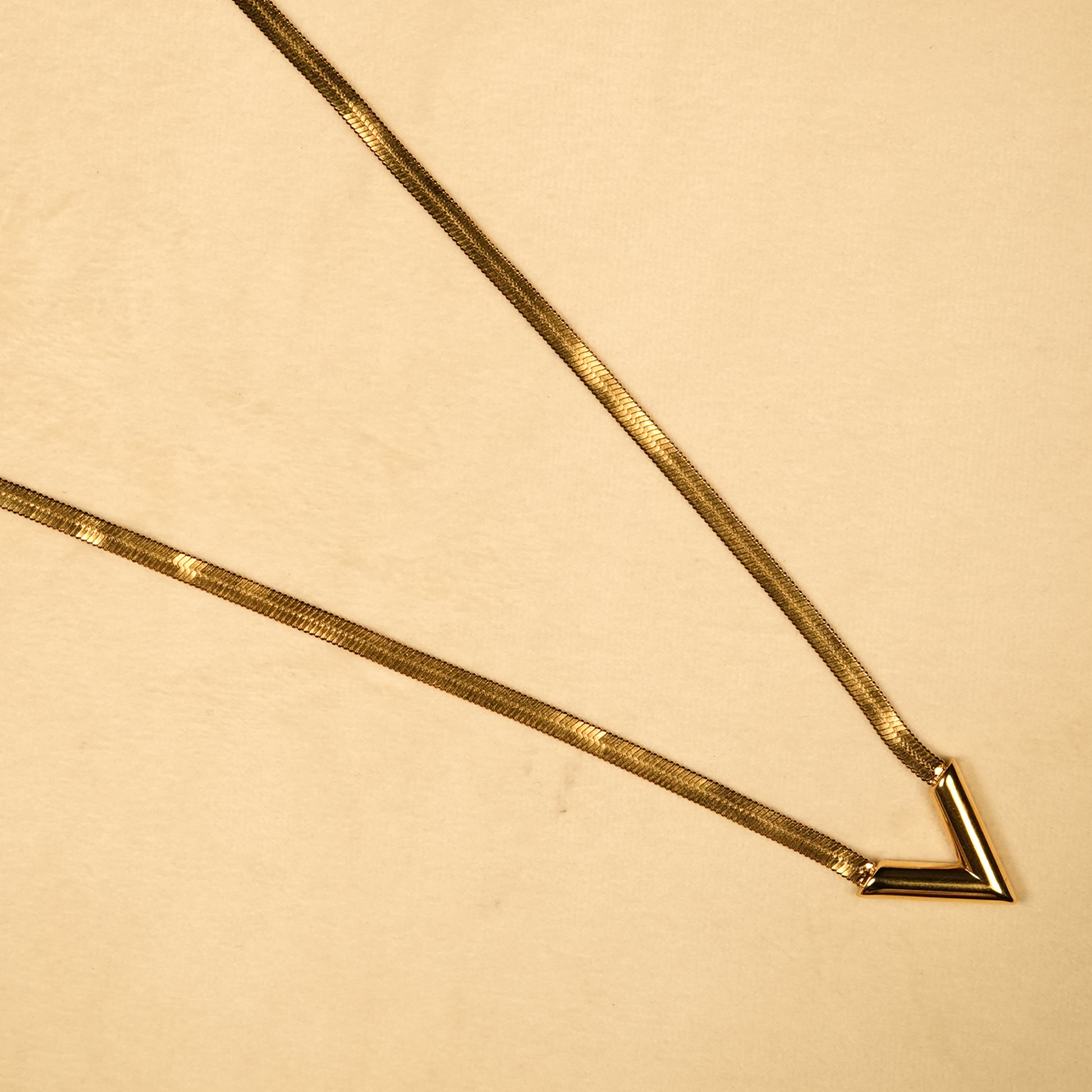 - Design Detail: V-shaped bar pendant with flat snake chain